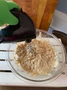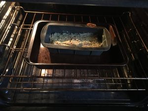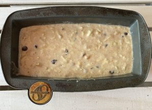 First, use either a non-sick loaf pan or light grease your pan. Preheat the oven to 325F.