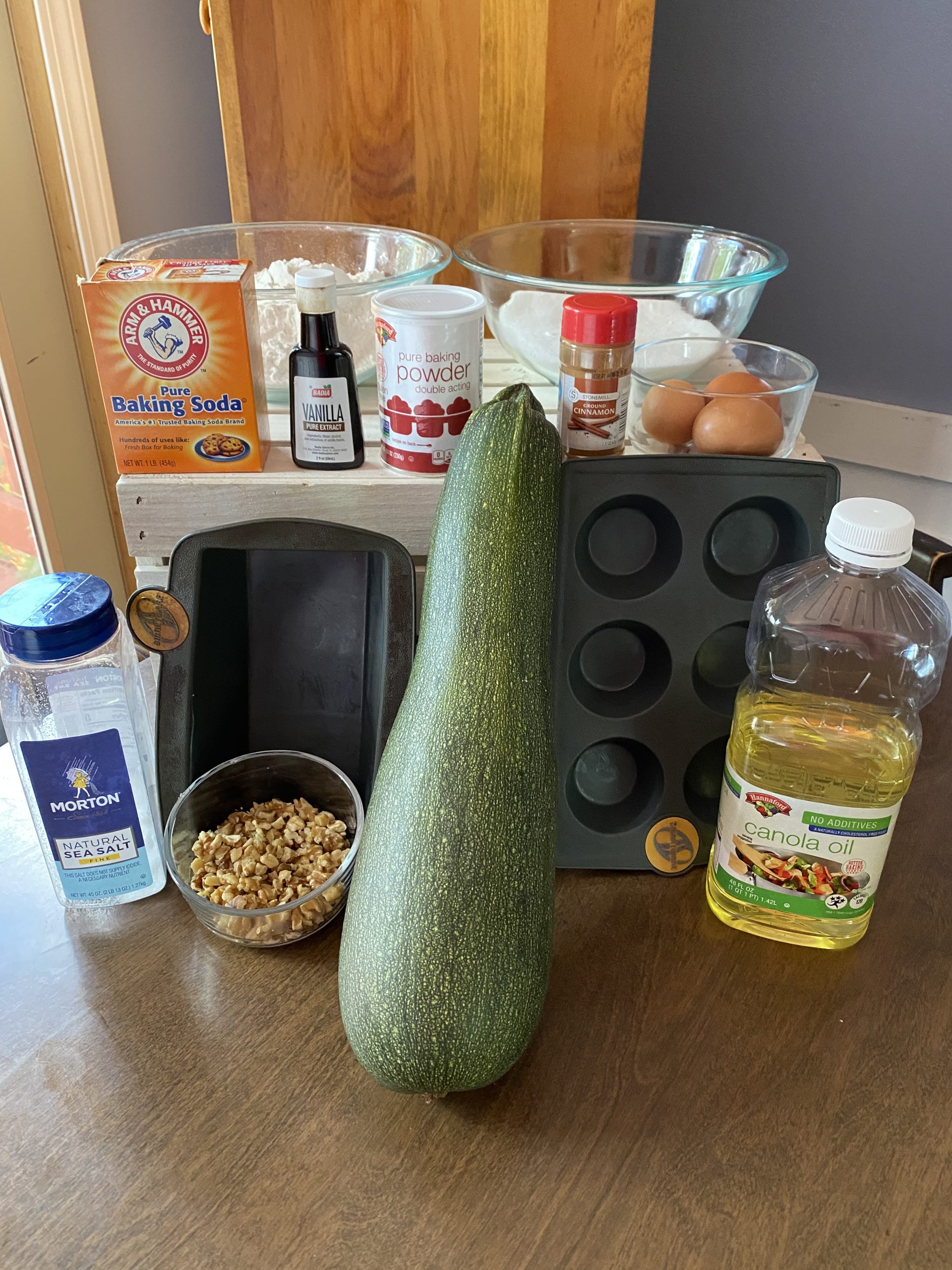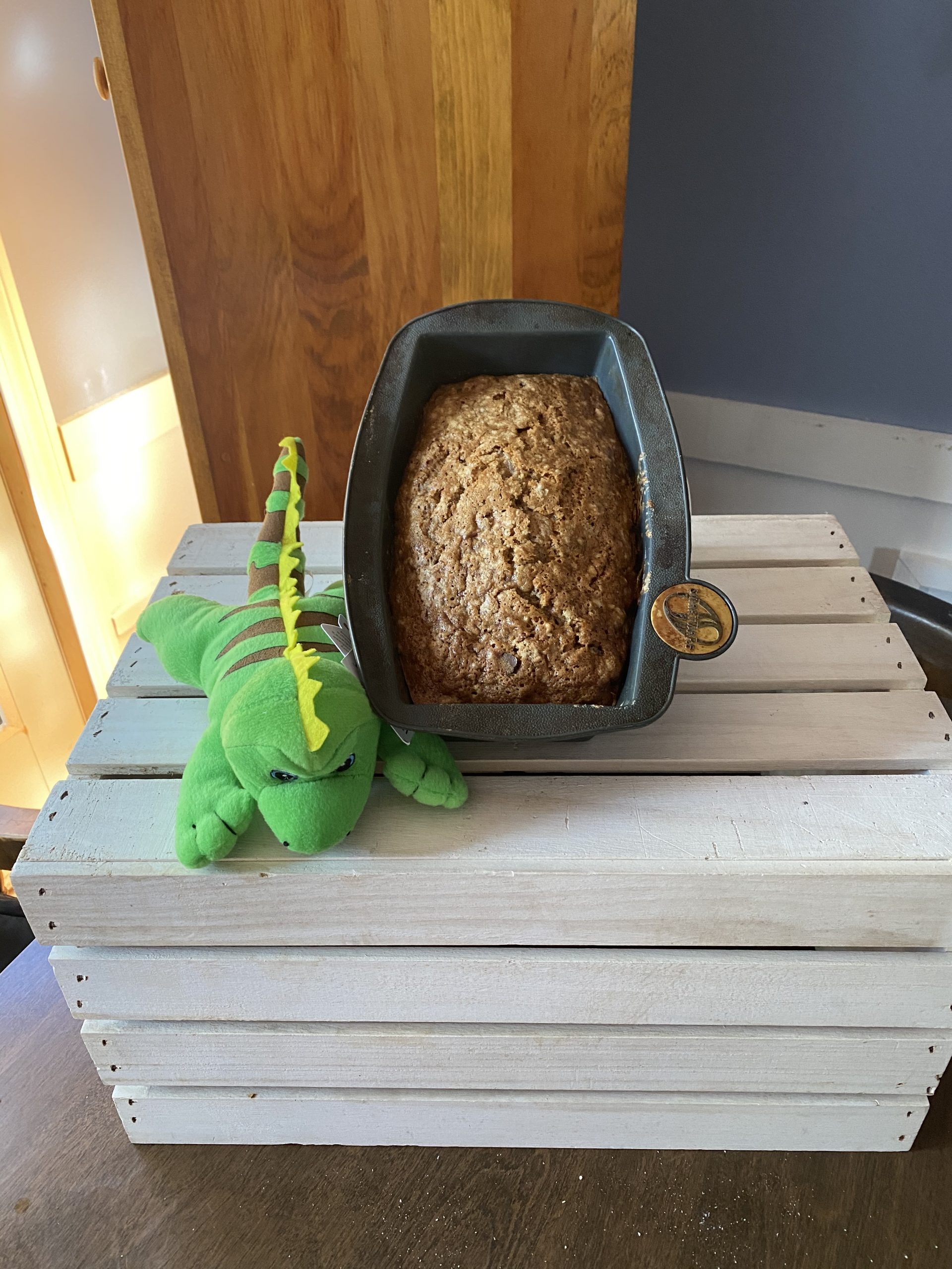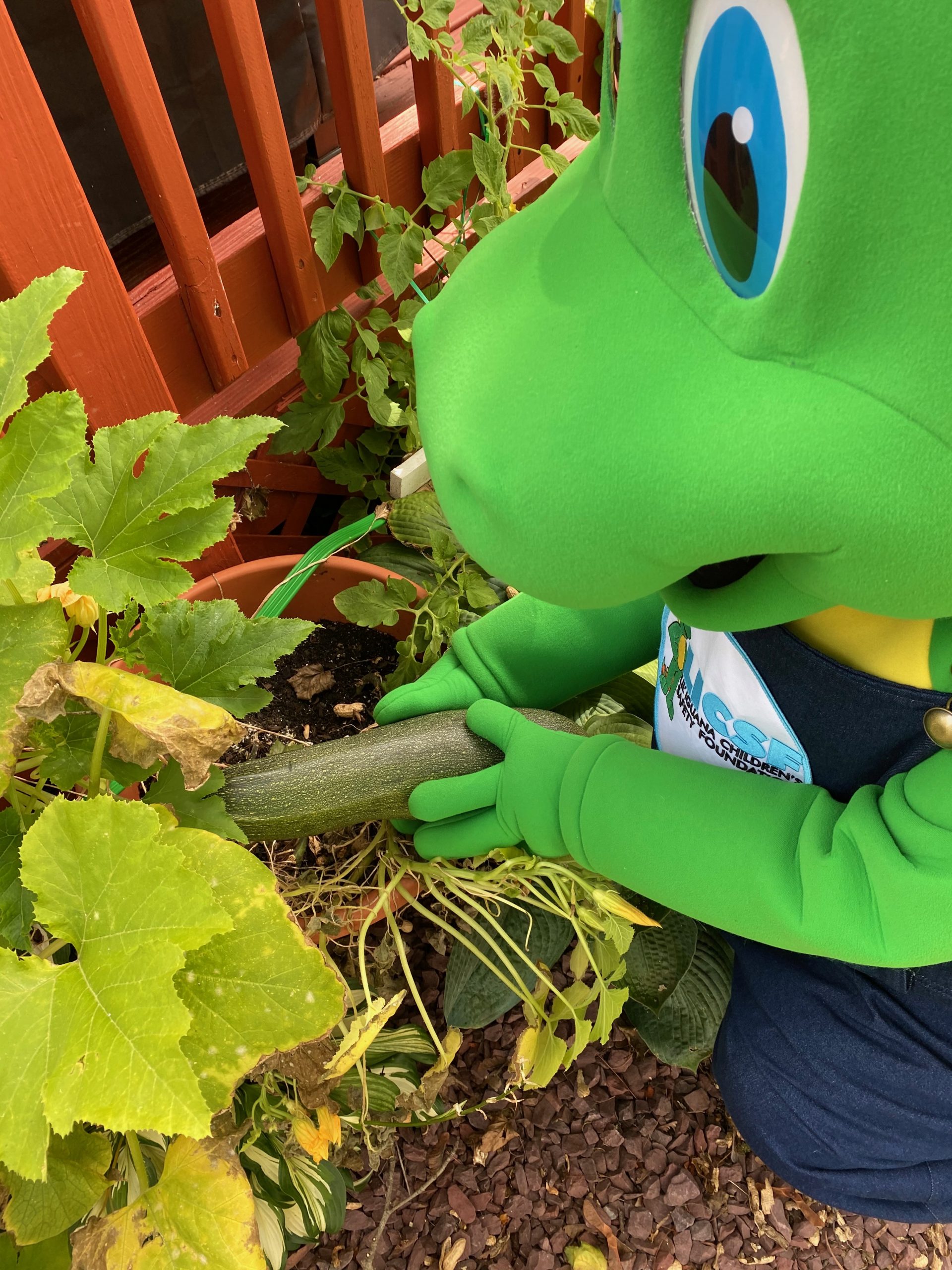 Lil’ Iguana noticed a big zucchini in the garden today. He has a party coming up and wanted to use the fresh produce to bake something special that everyone can enjoy.