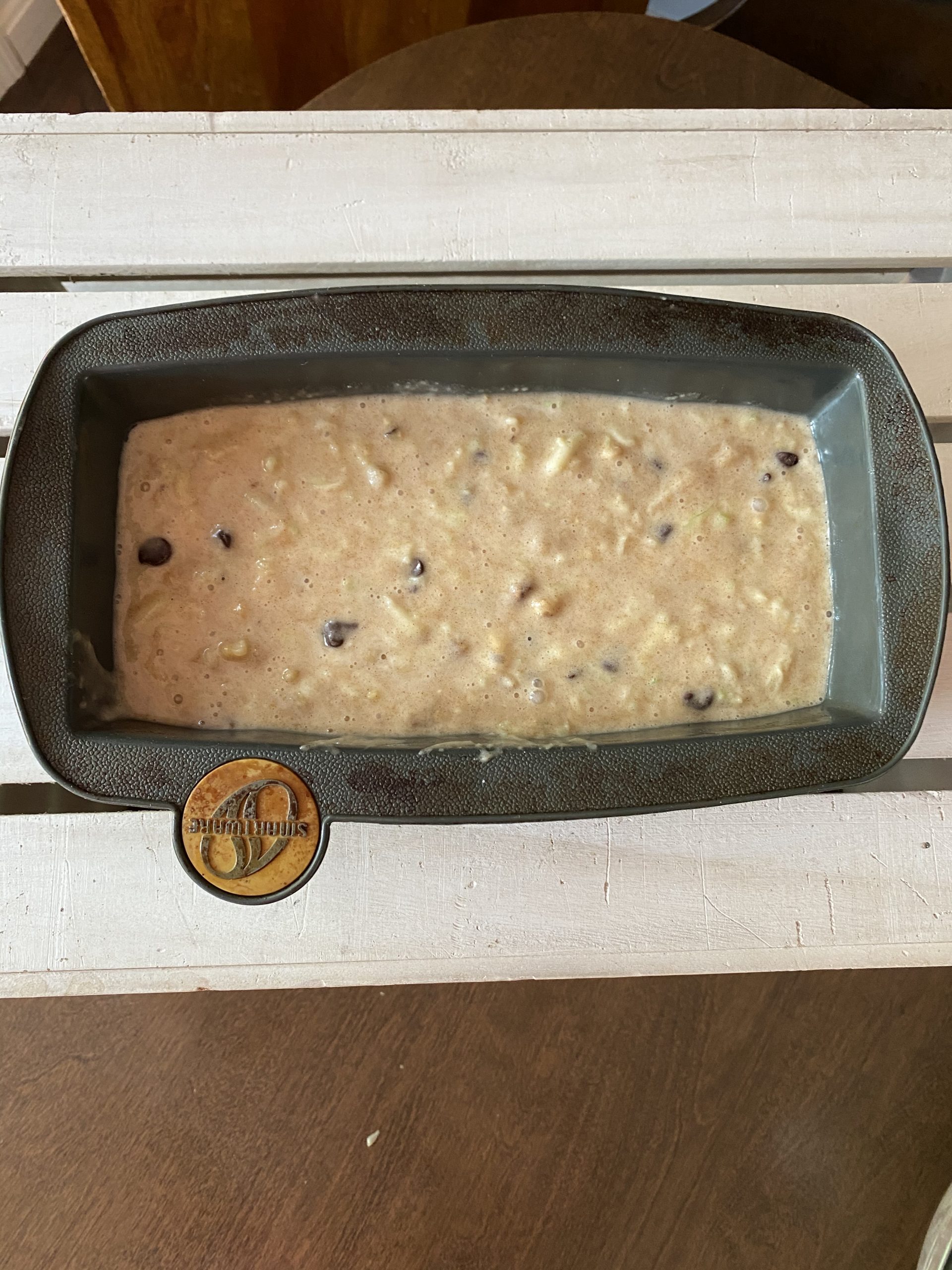 First, use either a non-sick loaf pan or light grease your pan. Preheat the oven to 325F.