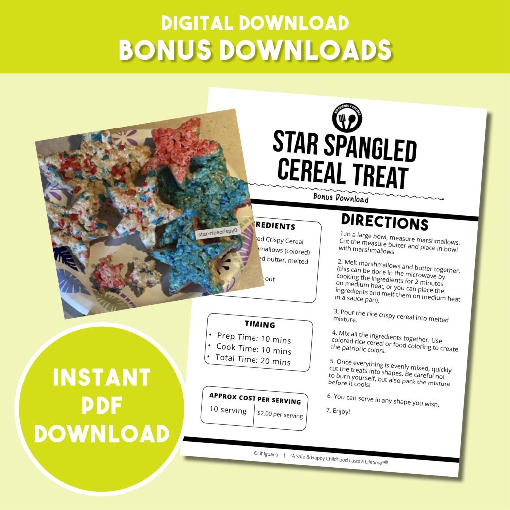 Star Spangled Cereal Treat Bonus Holiday Treat PREP TIME: 10 minutes COOK TIME: 10 minutes TOTAL TIME: 20 minutes YIELD: 10 servings APPROX COST PER SERVING: $1 5/5 Jump to Recipe Printable Facebook Twitter Pinterest Email Lil’ Iguana loves to share treats with others. Red, white, and blue are the colors of the American